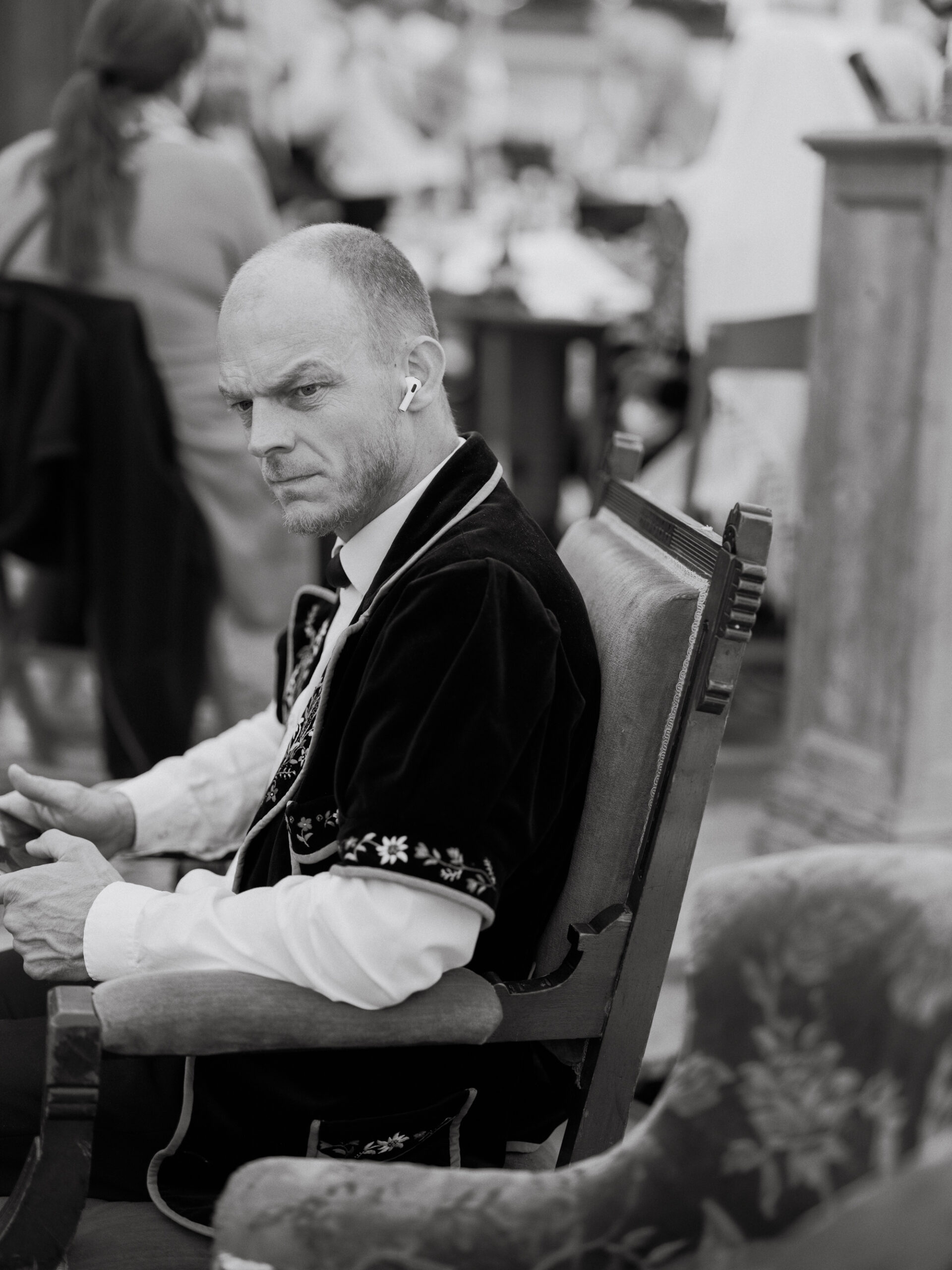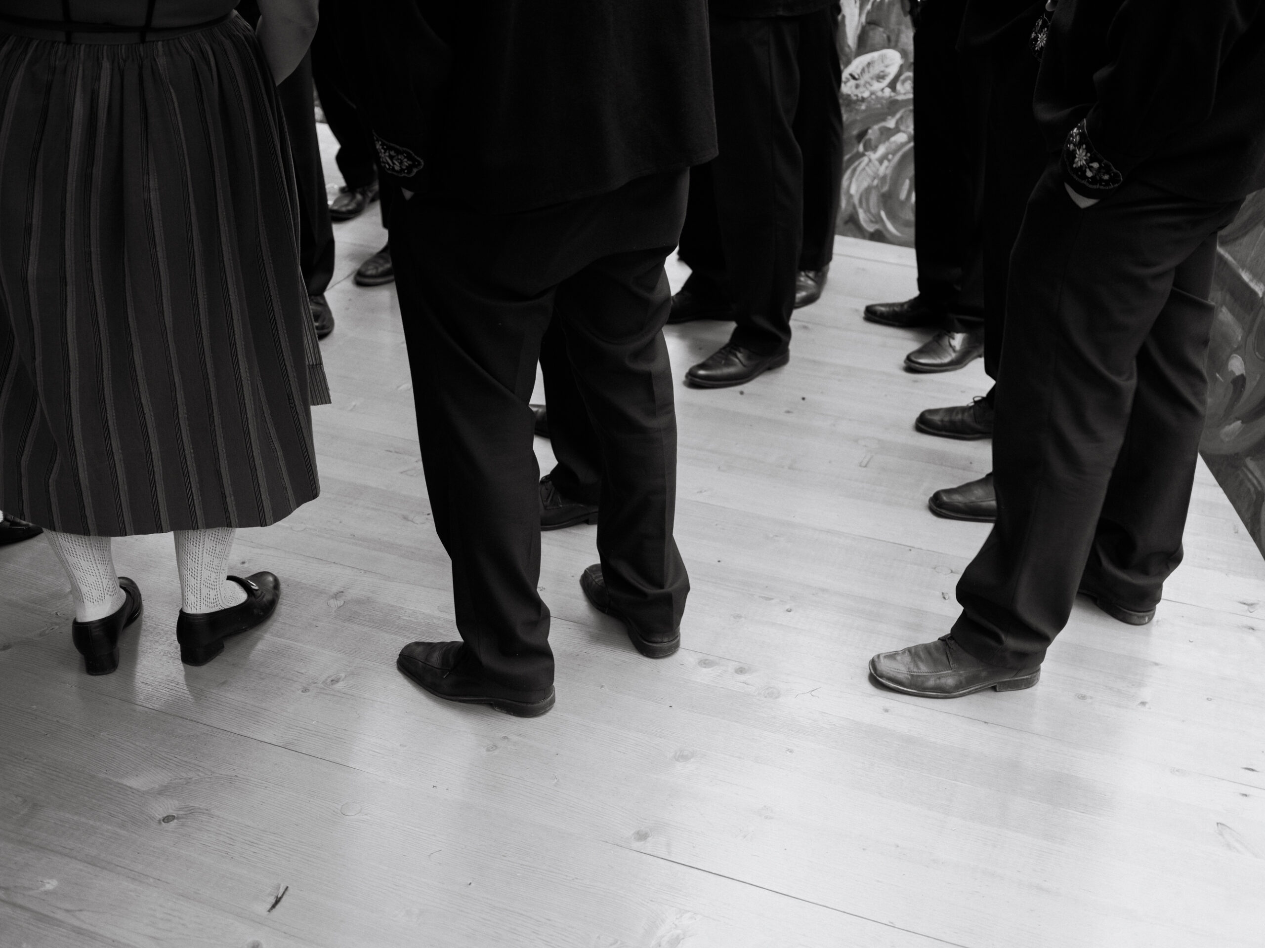 Das zweite Bild zeigt Füsse verschiedener Sänger*innen. Die letzte Aufnahme zeigt ein Mitglied des Trio Astelhorns in Tracht und mit Apple AirPod-Kopfhörern.