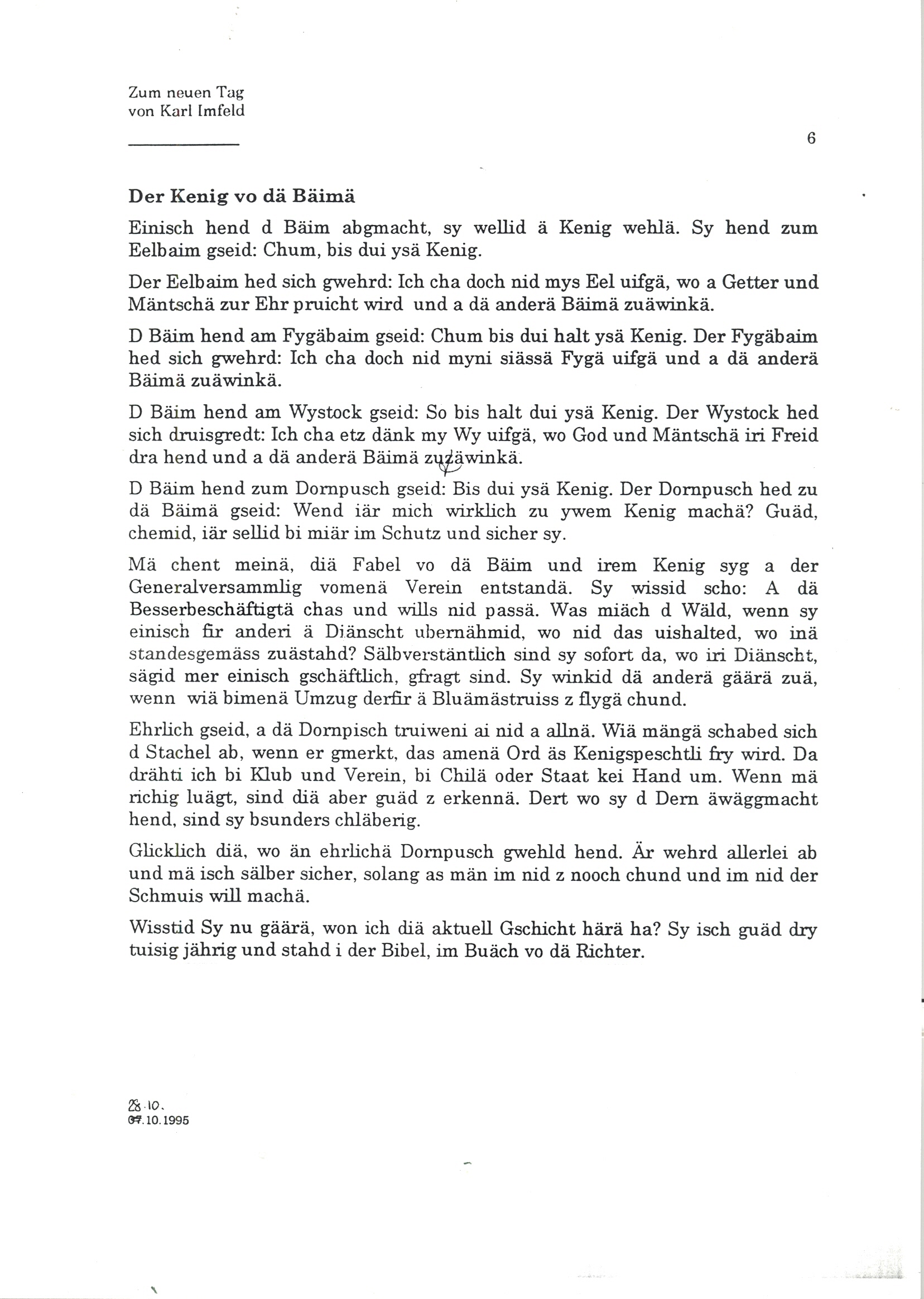 Einisch hend d Bäim abgmacht, sy wellid ä Kenig wehlä. Sy hend zum Eelbaim gseid: Chum, bis dui ysä Kenig. Der Eelbaim hed sich gwehrd: Ich cha doch nid mys Eel uifgä, wo a Getter und Mäntschä zur Ehr pruicht wird und a dä anderä Bäimä zuäwinkä. D Bäim hend am Fygäbaim gseid: Chum bis dui halt ysä Kenig. Der Fygäbaim hed sich gwehrd: Ich cha doch nid myni siässä Fygä uifgä und a dä anderä Baimä zuäwinkä. D Bäim hend am Wystock gseid: So bis halt dui ysä Kenig. Der Wystock hed sich druisgredt: Ich cha etz dänk my Wy uifgä, wo God und Mäntschä iri Freid dra hend und a d anderà Bäimà zuzäwinkä. D Bäim hend zum Dornpusch gseid: Bis dui ysä Kenig. Der Dornpusch hed zu dä Bäimä gseid: Wend iär mich wirklich zu ywem Kenig machä? Guäd, chemid, iär sellid bi miär im Schutz und sicher sy. Mà chent meinä, dià Fabel vo dä Bäim und irem Kenig syg a der Generalversammlig vomenä Verein entstandä. Sy wissid scho: A dä Besserbeschäftigtä chas und wills nid passä. Was miäch d Wäld, wenn sy einisch fir anderi ä Diänscht ubernähmid, wo nid das uishalted, wo inä standesgemäss zuästahd? Sälbverstäntlich sind sy sofort da, wo iri Diänscht, sägid mer einisch gschäftlich, gfragt sind. Sy winkid dä anderä gäärä zuä, wenn wiä bimenä Umzug derfir ä Bluämästruiss z flygä chund. Ehrlich gseid, a dà Dornpisch truiweni ai nid a allnä. Wiä mängä schabed sich d Stachel ab, wenn er gmerkt, das amenä Ord äs Kenigspeschtli fry wird. Da drähti ich bi Klub und Verein, bi Chilä oder Staat kei Hand um. Wenn mä richig luägt, sind diä aber guäd z erkennä. Dert wo sy d Dern äwäggmacht hend, sind sy bsunders chläberig. Glicklich diä, wo än ehrlichä Dornpusch gwehld hend. Är wehrd allerlei ab und mä isch sälber sicher, solang as män im nid z nooch chund und im nid der Schmuis will macha. Wisstid Sy nu gäärä, won ich diä aktuell Gschicht härä ha? Sy isch guäd dry tuisig jährig und stahd i der Bibel, im Buäch vo dä Richter.